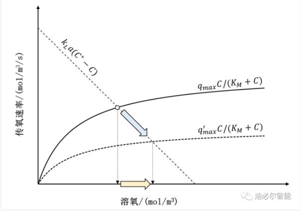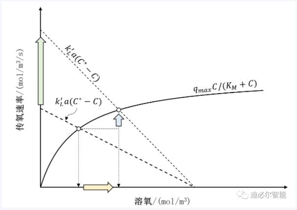 圖2b 在傳質(zhì)系數(shù)一定的情況下,微生物細(xì)胞代謝狀態(tài)對(duì)溶氧濃度和傳質(zhì)速率的影響。藍(lán)色箭頭表示耗氧量的下降,黃色箭頭表示溶氧濃度的增加[1]