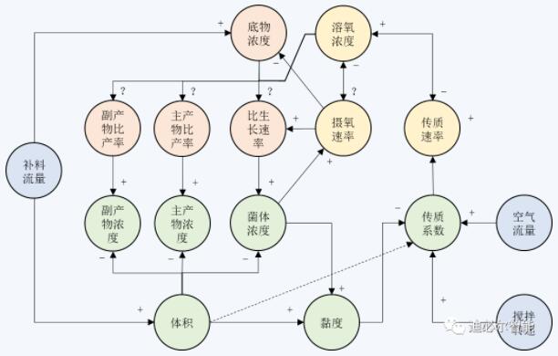 圖1 補(bǔ)料發(fā)酵過程主要操作參數(shù)與菌體生長、產(chǎn)物形成之間的相互影響[1]。
