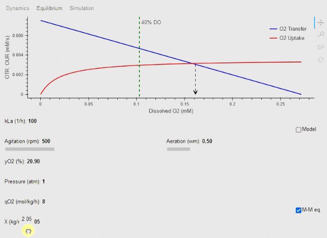 基于以上基本原理,我們搭建了溶氧過程的動(dòng)態(tài)模型。模型后臺(tái)運(yùn)行在我們的服務(wù)器上,前端以可交互網(wǎng)頁應(yīng)用的形式展示。該網(wǎng)頁應(yīng)用包括三個(gè)分頁面,其中Equilibrium分頁展示的是圖2所示的傳質(zhì)與生化反應(yīng)的之間的平衡關(guān)系。通過拖動(dòng)相應(yīng)的進(jìn)度條,可以考察攪拌轉(zhuǎn)速,通氣量,以及菌體濃度等參數(shù)對(duì)擬穩(wěn)態(tài)下溶氧濃度的影響。Dynamics頁面展示的是在一組給定的操作條件下,溶氧濃度從0達(dá)到平衡的動(dòng)態(tài)過程曲線。