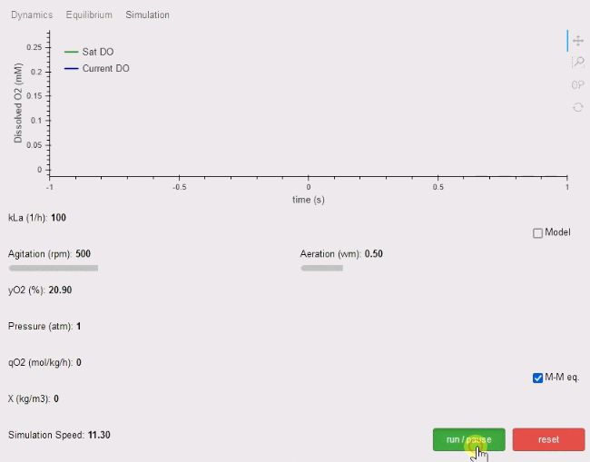 Simulation分頁更直觀的展示改變操作條件后溶氧重新達(dá)到擬穩(wěn)態(tài)的過程。用戶既可以直接設(shè)定kLa的值,也通過勾選Model框后,設(shè)定攪拌轉(zhuǎn)速rpm和通氣量(通風(fēng)比)vvm,程序根據(jù)經(jīng)驗(yàn)公式計(jì)算kLa;還可以通過調(diào)節(jié)氧氣濃度yO2和操作壓力Pressure,考察這兩個(gè)參數(shù)對(duì)溶氧過程的影響。針對(duì)含微生物或者細(xì)胞的反應(yīng)體系,用戶可以調(diào)節(jié)qO2和X滑動(dòng)條,設(shè)置比耗氧速率和細(xì)胞量,勾選M-M eq.選框后程序?qū)⒏鶕?jù)米氏方程計(jì)算攝氧速率。Simulation Speed滑動(dòng)條可以允許用戶設(shè)定時(shí)間流逝速度,默認(rèn)數(shù)值1即為模擬速度與現(xiàn)實(shí)速度相同。點(diǎn)擊run/pause按鈕可以控制模擬的開始與結(jié)束,點(diǎn)擊reset按鈕可以重置模擬過程。