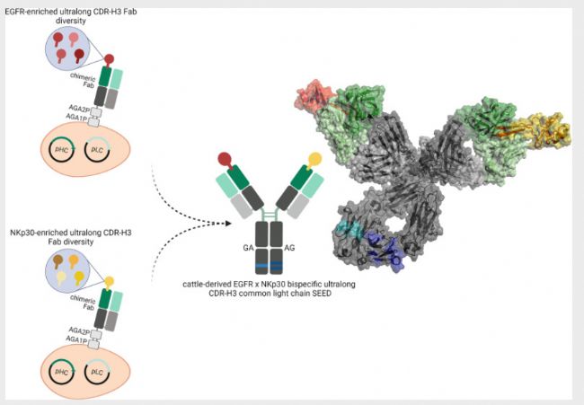 德國默克(Merck)的科學(xué)家們設(shè)計了基于牛CDR-H3雙特異性抗體,靶向腫瘤細(xì)胞上的表皮生長因子受體(EGFR)以及自然殺傷(NK)細(xì)胞上的天然細(xì)胞毒性受體NKp30;谂gG的雙特異性抗體(BsAbs)引發(fā)了有效的NK細(xì)胞重定向,從而引發(fā)了EGFR過表達(dá)的腫瘤細(xì)胞裂解以及促炎細(xì)胞因子的強勁釋放