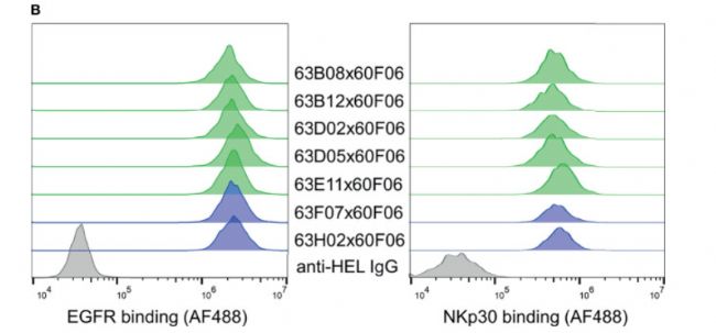 右圖為雙特異抗體與NKp30結(jié)合:檢測雙特異性抗體是否可以同時結(jié)合兩個靶點,在bsAb以100 nM的濃度與A431細(xì)胞孵育和洗滌后,與His標(biāo)簽的NKp30孵育30分鐘。再將細(xì)胞與抗His抗體和碘化丙啶孵育?梢,bsAbs可以同時結(jié)合A431細(xì)胞和NKp30。