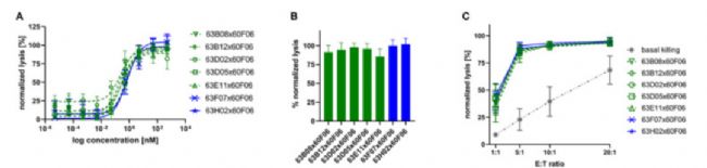 可見,活性最佳的幾個BsAbs顯示出nM級的EC50殺傷效果(A圖),接近于100%的最大殺傷率(B,C圖)