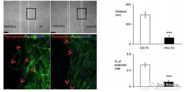 在文中,研究人員使用Ibidi開發(fā)的傷口愈合插件進(jìn)行了這一共培養(yǎng)“傷口愈合”實(shí)驗(yàn)。這是一種雙孔的硅膠插件,可以放在培養(yǎng)皿中,插件兩孔間的孔壁寬度為500μm。將兩種細(xì)胞分別種在插件的兩個孔中,等待細(xì)胞貼壁長滿后,將插件移除,這樣,兩孔間的縫隙就是一個無細(xì)胞的“劃痕”。不僅能夠觀測到周細(xì)胞向內(nèi)皮細(xì)胞遷移的行為,而且可以使用細(xì)胞免疫熒光染色的方法,對周細(xì)胞內(nèi)的細(xì)胞骨架排列進(jìn)行觀測,確定細(xì)胞的一個趨化行為。