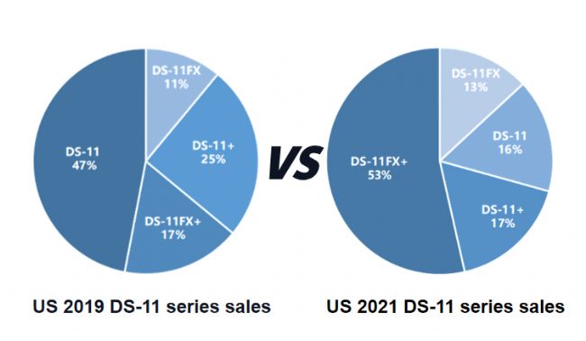 三月初,一場內(nèi)部會議的數(shù)據(jù)對比圖引人注目,Denovix品牌的DS-11FX+系列熒光/超微量全功能分光光度計在美國本土市場的銷量達到了總銷量的66%,而只有超微量功能的DS-11占比僅為16%,這個數(shù)據(jù)在兩年前幾乎是相反的;值得一提的是,帶比色皿模式的占比也達到了70%。