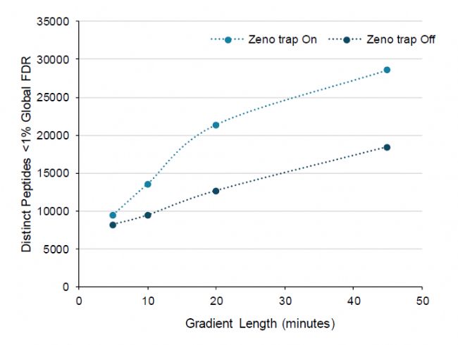 圖2. 激活Zeno阱后肽段鑒定數(shù)量增加。在global FDR 為1%時(shí),200 ng K562細(xì)胞裂解液在不同梯度中的肽段鑒定數(shù)量。Zeno阱大大增加了所有梯度中的肽段鑒定數(shù)量。