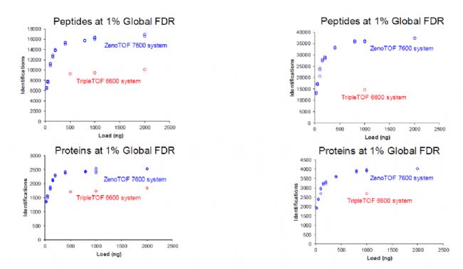圖3. 在10min (左側(cè))和45min (右側(cè))梯度中ZenoTOF 7600系統(tǒng)與TripleTOF 6600系統(tǒng)鑒定到肽段和蛋白質(zhì)數(shù)量對(duì)比。與TripleTOF 6600系統(tǒng)(紅色)相比,ZenoTOF 7600系統(tǒng)(藍(lán)色)鑒定出更多的肽段和蛋白質(zhì)。