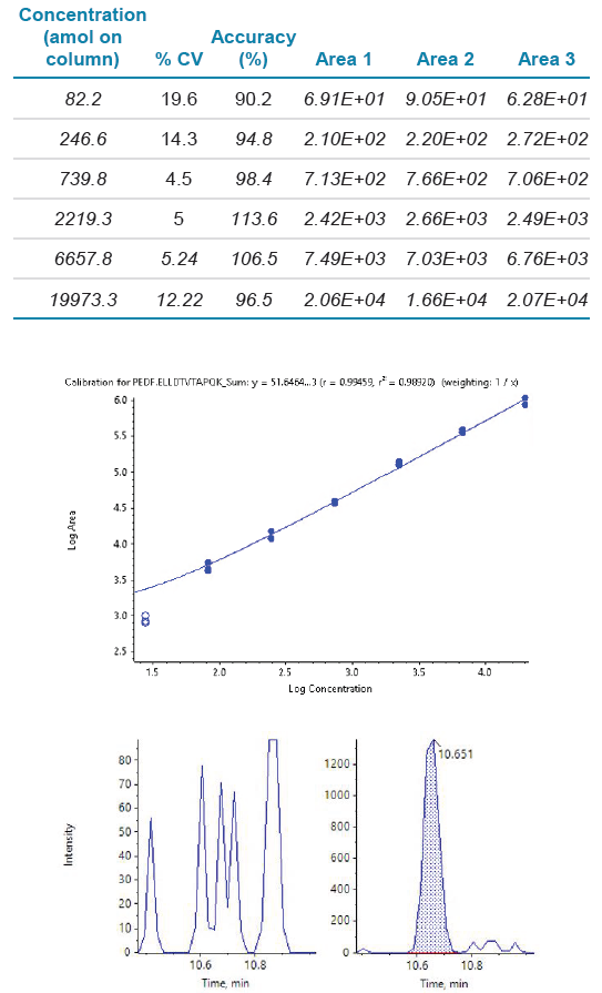 圖7. PEDF.ELLDTVTAPQK 的濃度曲線。ELLDTVTAPQK 在 500 ng血漿中的濃度曲線顯示出良好的重現(xiàn)性和線性,從柱上 82.2 amol到柱上 19.9 fmol的最高測(cè)量點(diǎn)(r2= 0.995)。定量下限 (LLOQ) 的肽信號(hào)(4個(gè)碎片離子的總和)顯示在右下方,具有良好的信噪比,并通過(guò)了LLOQ 的生物分析標(biāo)準(zhǔn)?瞻走M(jìn)樣的信號(hào)在左下角,曲線的統(tǒng)計(jì)數(shù)據(jù)顯示在頂部的表格中。