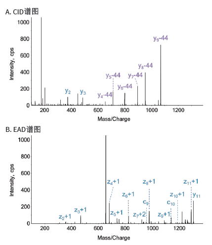 圖8. TVDGPSGKmaLWR肽段在CID和EAD模式下的MS/MS譜圖。丙二;亩 (m/z656.3320) 分別采用(A) CID模式和(B) EAD模式(KE=5 eV)進(jìn)行分析。CID碎裂會(huì)導(dǎo)致-CO2(-44)的中性丟失,無(wú)法檢測(cè)到“完整的”PTM特異性區(qū)分性離子。全面的EAD解離產(chǎn)生了高強(qiáng)度的碎片離子,為直接的PTM位點(diǎn)定位提供了證據(jù)。