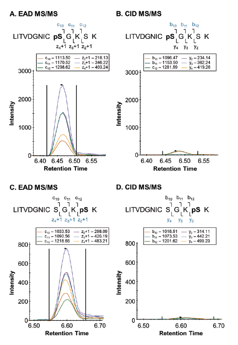 圖11. EAD解離使不穩(wěn)定的磷酸基團(tuán)得以保存。在Skyline中提取 (A, B) LITVDGNICpSGKSK和 (C, D) LITVDGNICSGKpSK在 (A, C) EAD模式 (KE=2)和 (B, D) CID模式下分析的磷酸化異構(gòu)體。在EAD模式下,不穩(wěn)定的磷酸基團(tuán)被保留。