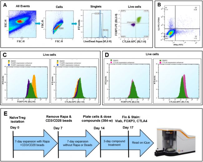 圖2. 使用iQue®進行人類Treg細胞擴增、表征和表型篩選。(A)擴增的Treg細胞表達高水平的FOXP3和CTLA4;(B) 擴增的Treg細胞缺乏IL-2的產生;(C, D) 導致FOXP3 MFI增加或減少(C)和導致CTLA4 MFI增加(D)的代表性化合物的柱狀圖;(E)人類Treg細胞表型篩選簡要實驗流程,包括Treg細胞的分離、擴增、小分子化合物處理以及細胞活力、FOXP3和CTLA4表達。