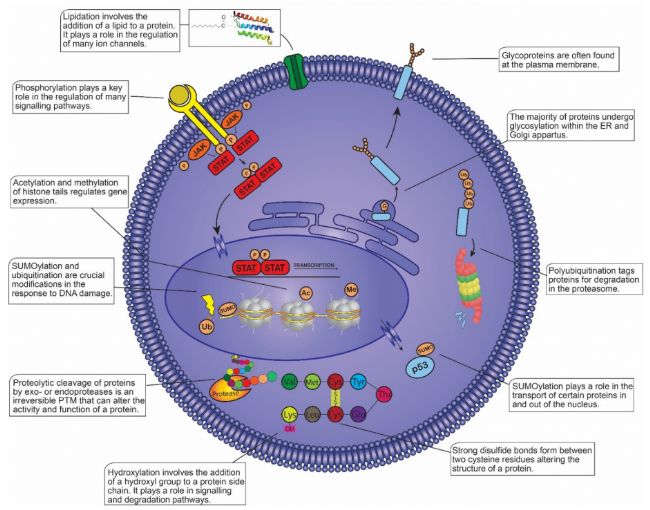 蛋白質(zhì)是細(xì)胞的功能分子,基因功能的執(zhí)行者,從核糖體剛翻譯出來的蛋白質(zhì)是沒有功能的,需要到達(dá)細(xì)胞的指定位置(胞內(nèi)、胞外,和不同的亞細(xì)胞器等)并形成特定的空間結(jié)構(gòu),才能發(fā)揮其功能作用。翻譯過程會(huì)發(fā)生不同類型以及水平的蛋白質(zhì)翻譯后修飾(PTMs; 在UniProt數(shù)據(jù)庫中報(bào)告了400種以上翻譯后修飾種類,真核生物中有326種,細(xì)菌中有250種,古生菌中有80種)。PTM在幾乎所有細(xì)胞過程中都起著至關(guān)重要的作用,包括細(xì)胞周期、降解、凋亡、細(xì)胞信號(hào)傳導(dǎo)、轉(zhuǎn)錄等(圖1)。
