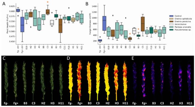 這項(xiàng)工作介紹了一種在小麥中發(fā)現(xiàn)新的抗赤霉病細(xì)菌生防劑的替代工作流程。與隔離物收集的大規(guī)模測(cè)試不同,我們從不同的接種物開始,在灌漿期從田間種植的小麥穗中提取微生物組。在感染禾谷鐮刀菌PH1的分離小麥穗上,產(chǎn)生了四個(gè)不同的微生物群落,這些微生物群落暴露在3個(gè)14天的非培養(yǎng)實(shí)驗(yàn)富集物中。我們發(fā)現(xiàn),一個(gè)細(xì)菌群落在3個(gè)周期后減少了感染癥狀,隨后選擇該細(xì)菌群落通過(guò)限制稀釋來(lái)分離細(xì)菌。所有94個(gè)分離株均在體外和植物試驗(yàn)中進(jìn)行了測(cè)試,并選擇了14個(gè)分離株在分離的小麥穗上進(jìn)行了進(jìn)一步測(cè)試。結(jié)果似乎表明,我們的富集方法導(dǎo)致細(xì)菌在FHB控制方面具有不同的作用模式。波斯歐文氏菌(Erwinia persicina)分離物C3的疾病嚴(yán)重程度(Fv/Fm)顯著降低,波斯歐文氏菌(Erwinia persicina)C3和假單胞菌(Pseudomonassp.)B3的真菌生物量(cGFP)顯著降低。然而,這兩種治療的真菌毒素分析顯示,DON水平?jīng)]有降低。盡管如此,安那提泛球菌(Pantoea ananatis)H3和H11以及波斯歐文氏桿菌(Erwinia persicina)H2能夠?qū)ON濃度降低50%以上,盡管這些影響在統(tǒng)計(jì)學(xué)上并不顯著。最后,波斯歐文氏菌(Erwinia persicina)H2也顯示出DON對(duì)植物毒性較小的DON-3G的顯著更高的糖基化。據(jù)報(bào)道,通過(guò)富集循環(huán)分離的細(xì)菌屬在開放棲息地發(fā)育的微生物群落中占主導(dǎo)地位,這表明分離的細(xì)菌可以降低禾谷鐮刀菌在穗葉層上的感染壓力。