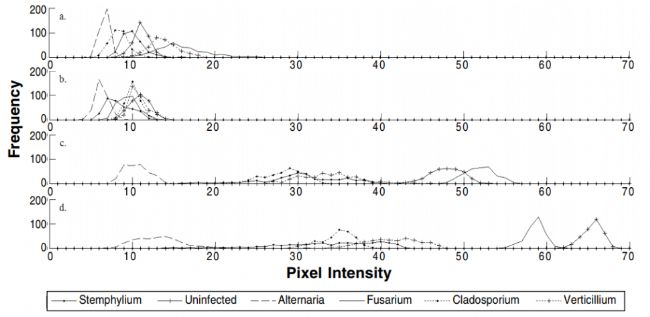 在代表可見光波長(zhǎng)(395-700 nm)的圖片中,所有種子都呈現(xiàn)黑色,無法區(qū)分六種種子類別(圖2a)。在代表NIR波長(zhǎng)(850-970 nm)的圖片中,可以從視覺上區(qū)分未感染的種子和受感染的種子,但鐮刀菌屬受感染的種子除外,它們看起來像未感染的種子(圖2b)。在六個(gè)類別的反射分布模式(以像素強(qiáng)度測(cè)量)中,比較了人工感染和自然感染的種子(圖3)。NIR波長(zhǎng)由基于890 nm數(shù)據(jù)的曲線圖表示。對(duì)于自然和人工感染的種子,顯示了三組模式,其峰值分別為低(鏈格孢菌)、中(莖葉菌、枝孢菌和黃萎。┖透呦袼貜(qiáng)度(未感染和鐮刀菌)(圖3 c+d)。在以550 nm表示的可見光波長(zhǎng)中,沒有組,但自然和人工感染種子的低像素強(qiáng)度的類的峰值(圖3 a+b)。