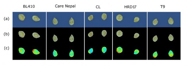 圖1.捕獲的五個番茄種子品種的多光譜圖像。(a)藍色背景分割后的圖像;種子上的白邊顯示ROI的選擇(b);525nm下的種子圖像(c)