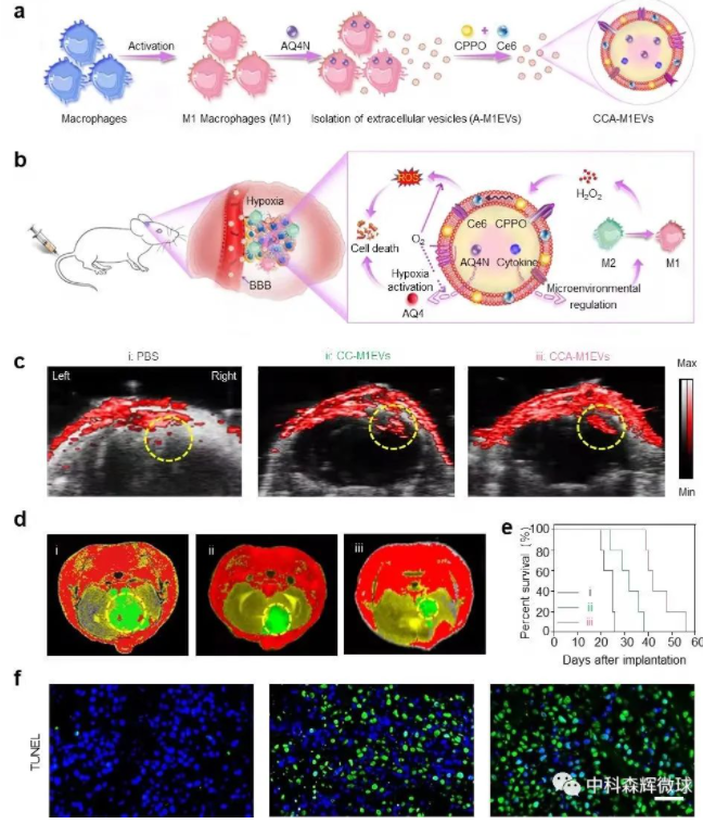 圖2 基于M1EVs的仿生劑型構(gòu)建方案、抗腫瘤機制及PDX療效:a. 仿生劑型的構(gòu)建示意圖;b. 仿生劑型在GBM模型中的累積及免疫調(diào)節(jié)、化學激發(fā)動力學和乏氧觸發(fā)化療的協(xié)同作用示意圖;c. 基于光聲成像分析仿生劑型在PDX小鼠GBM病灶中的累積;d. 各組PDX小鼠的抑瘤效果(20天核磁成像);e. 各組PDX小鼠的生存期分析;f. 各組PDX小鼠的TUNEL分析(標尺50 µm)