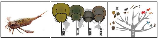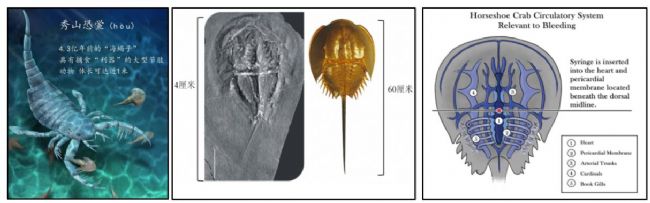 (左:2021年重慶秀山,恐鱟生態(tài)復(fù)原圖,距今4.3億年[3];中:2007年云南羅平,羅平鱟,距今2.4億年[4];右:鱟血液循環(huán)系統(tǒng))