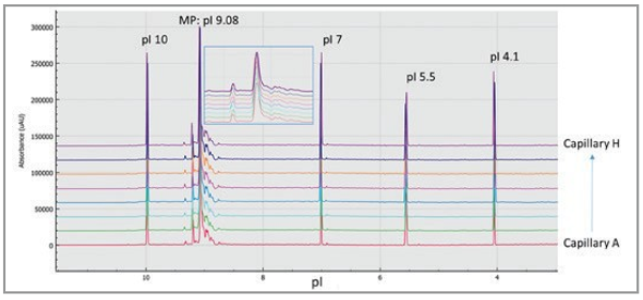 圖4. 同一樣品( NIST 單抗)在 8 通道中的CIEF結(jié)果