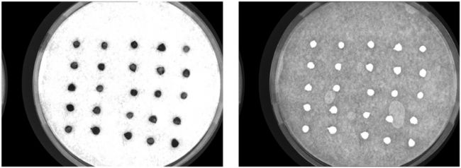 在19個不同光譜帶的范圍內(nèi)捕獲了1280x960個像素的圖像。圖1顯示了在395nm(左)和910 nm(右)下捕獲的包含 25 個中等大小菠菜種子的圖像。只有圖像中的種子是感興趣的,因此執(zhí)行的第一步是分離種子從背景(濾紙),使用閾值進行分割。下一步是使用基于灰度共生矩陣(GLCM)的灰度統(tǒng)計和Haralick紋理特征從每個圖像(每個波長/波段一個圖像)中提取特征。