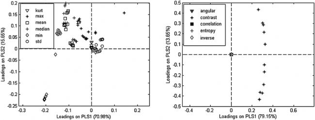 圖2.峰態(tài)、最大值、平均值、中值、最小值和標準偏差數(shù)據(jù)(左)和角度、對比度、相關性、熵和逆數(shù)據(jù)(右)的偏最小二乘判別分析載荷(PLS1 與 PLS2)圖