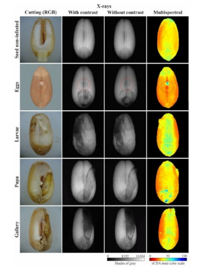 摘要:射線照相和多光譜圖像分析有可能成為評估種子質(zhì)量和內(nèi)部昆蟲侵?jǐn)_的有效、客觀的方法。本研究的目的是驗(yàn)證射線照相和多光譜分析在檢測小麥種子中由Sitotroga grainella (Olivier) 及其不同發(fā)育階段引起的跡象和損害方面的效率。該實(shí)驗(yàn)以完全隨機(jī)設(shè)計(jì)進(jìn)行,50 粒種子重復(fù)6次。對樣品進(jìn)行實(shí)驗(yàn)室誘導(dǎo)的侵染,并在5天和10天后進(jìn)行射線照相和多光譜分析。之后,將種子浸入水中24小時(shí),然后用切割刀片切片。量化具有卵或產(chǎn)卵跡象的種子、幼蟲、蛹、成蟲和昆蟲畫廊的數(shù)量。使用廣義線性模型 (GLM) 方法并使用 Tukey 檢驗(yàn) (p<0.05) 來比較平均值。一般來說,射線照相(有或沒有對比)和多光譜方法是評估受蟲害和未受蟲害的小麥種子的可行工具。多光譜分析僅能有效識(shí)別種子表面的卵,而不能檢測種子內(nèi)是否存在幼蟲和蛹。