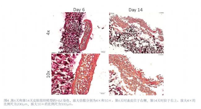 該皮膚組織模型的構(gòu)建方法創(chuàng)建了一個(gè)完整且堅(jiān)固的結(jié)構(gòu),可保持它在整個(gè)實(shí)驗(yàn)過程中的形狀。樣品橫切面的H&E染色初步表明,6天時(shí)真皮和表皮這兩個(gè)隔室之間的連接很弱。但在第14天,兩層已經(jīng)合并(圖4)。在第14天,可以看到表皮平滑地跟隨真皮的輪廓,真皮和角質(zhì)形成細(xì)胞開始重組。
