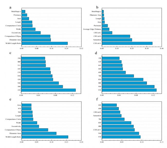 對(duì)于具有形態(tài)數(shù)據(jù)的LDA模型,前5個(gè)特征解釋了總變異的72.98%,其次是寬長(zhǎng)比 (24.60%)、直徑面積 (15.56%)、緊湊橢圓 (15.33%)、偏心率 (10.13%) , 和寬度 (7.36%), 表明品種之間的形態(tài)區(qū)分主要基于形狀特征 (圖 5a)。對(duì)于光譜數(shù)據(jù),470 nm (12.75%)、490 nm (9.74%)、940 nm (8.79%)、430 nm (7.44%)、970 nm (7.28%) 是前五個(gè)特征加起來(lái) LDA的 46.00% 變化(圖5c)。對(duì)于形態(tài)和光譜數(shù)據(jù)的組合(圖5e),寬度/長(zhǎng)度比(15.53%)、直徑面積(11.60%)、緊湊橢圓(8.81%)、偏心率(5.76%)和寬度(5.14%)是前5個(gè)特征,占LDA變異的46.86%,說明形態(tài)特征對(duì)品種鑒別有很大貢獻(xiàn)。