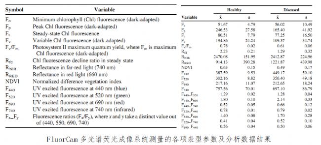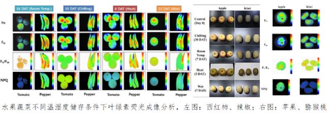 葉綠素熒光成像技術從問世以來就是植物脅迫識別與研究的最重要技術之一。浙江大學使用FluorCam葉綠素熒光成像系統發(fā)現了柑橘黃龍病的光合指紋。研究者通過對健康葉片、感染黃龍病葉片和養(yǎng)分缺乏葉片進行葉綠素熒光成像分析,確定了黃龍病獨一無二的熒光標志,結合葉綠素熒光參數與成像圖,對葉片黃龍病取得了最佳識別分類效果,準確率達到97%。后續(xù),浙江大學又進行了一系列工作研究黃龍病葉片熒光特性與冷熱季節(jié)變換的關系。