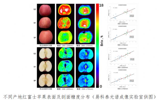 同時,高光譜成技術還可以對果實營養(yǎng)進行無損分析。易科泰光譜成像實驗室技術人員,使用PhenoTron®-HSI果實品質高光譜無損檢測技術(400-1700nm),分別對產自甘肅莊浪(GZ)、陜西宜川(SY)、山東平度(SP)三個不同產地的2021年秋季采摘的紅富士蘋果進行光譜成像分析,并分別選取三種樣品表面及剖面各10個區(qū)域實測糖度,建立預測模型評估糖度分布。這一技術將會助力柑橘黃龍病的防治與研究工作。