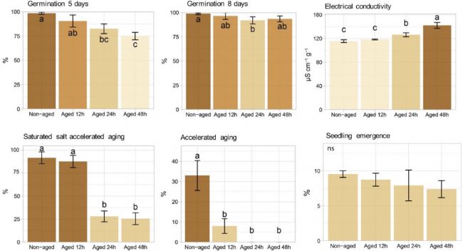 發(fā)芽率隨著種子老化而降低,尤其是在播種后5天(圖1)。雖然電導(dǎo)率(種子膜完整性的間接指標(biāo))在老化24小時(shí)和48 小時(shí)的種子中增加(圖1),但飽和鹽加速老化(SSAA)將種子分為兩組,即種子老化0和12小時(shí)與陳化24和48小時(shí)的種子。同時(shí),傳統(tǒng)的人工老化(AA)進(jìn)一步從老化的種子中切下未老化的種子。出苗試驗(yàn)無(wú)法區(qū)分種子類別(圖1)。