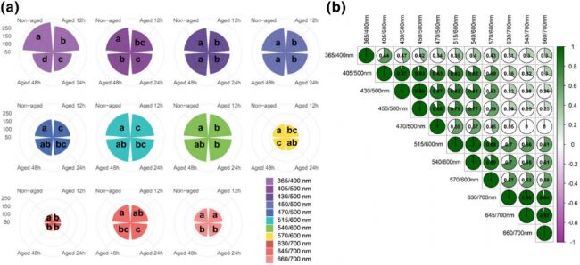 種子的平均自發(fā)熒光光譜在365至540nm(470nm除外)的激發(fā)波長(zhǎng)下較高(圖 3a)。在365/400nm、405/500nm和630/700nm激發(fā)發(fā)射組合下有效分離未老化種子;在這些組合中,365/400 nm 提供了對(duì)種子類別最精細(xì)的區(qū)分(圖3a)。帶寬之間的最高相關(guān)系數(shù)為:1.00(515/600 nm 對(duì) 540/600 nm)、0.99(430/500 nm 對(duì) 450/500 nm;630/700 nm 對(duì) 645/700 nm)和 0.97(405/500 nm vs 430/500;645/700 nm vs 660/700 nm)(圖 3b)。