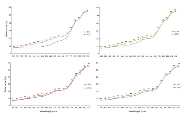 光譜反射率表示從UV(365 nm)到短波NIR(970nm)的19個波長處的像素強(qiáng)度。我們分析了19個波段下老化種子和非老化種子的光譜反射率,發(fā)現(xiàn)它們表現(xiàn)出相似的趨勢,尤其是在450nm至690nm的光譜范圍內(nèi),CK(2019 年收獲)表現(xiàn)出最高光譜反射率。在NIR區(qū)域(從 850 到 970 nm),這種趨勢消失了,2011年收獲的老化種子呈現(xiàn)出更高的反射強(qiáng)度。我們分別探索了四次比較,觀察到2004年和2019年收獲的種子之間的最大差異(圖2)。所有老化種子組的反射強(qiáng)度與未老化種子的差異很大。