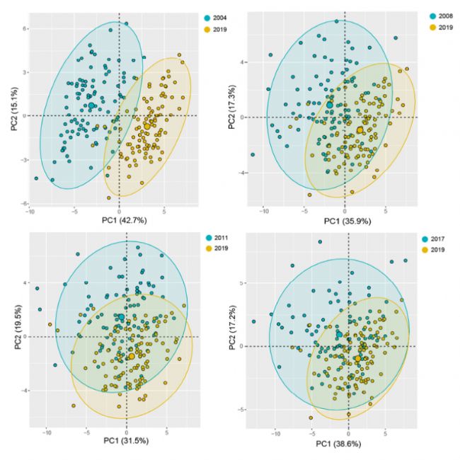 圖4.基于不同年份種子的形態(tài)和多光譜數(shù)據(jù)的PCA圖