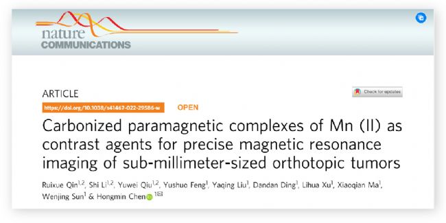 2022年4月11日,國際學術(shù)期刊Nature Communications在線發(fā)表了廈門大學分子疫苗學和分子診斷學國家重點實驗室陳洪敏課題組的研究成果“Carbonized paramagnetic complexes of Mn (II) as contrast agents for precise magnetic resonance imaging of sub-millimeter-sized orthotopic tumors”。