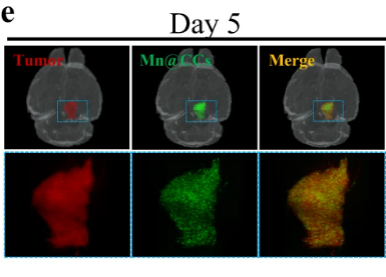 原文Fig. 7e 3D 熒光成像采用锘海 LS 18 平鋪光片顯微鏡以單細胞分辨率對全腦及腫瘤進行3D熒光成像(灰色:全腦輪廓;紅色:表達RFP膠質(zhì)母細胞;綠色:Mn@CCs)