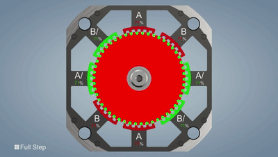 下圖生動(dòng)的演示了兩相步進(jìn)電機(jī)的工作原理:其轉(zhuǎn)子有50齒,而定子只有48齒,分為8個(gè)主極。如果將這8個(gè)主極分為4對(duì),我們會(huì)發(fā)現(xiàn)其中1對(duì)定子與轉(zhuǎn)子的齒牙是完全對(duì)齊的,一對(duì)定子與轉(zhuǎn)子的齒牙是錯(cuò)牙的,另外兩組的定子與轉(zhuǎn)子的齒牙則是半對(duì)齊的。當(dāng)給定子一個(gè)脈沖信號(hào)時(shí),定子磁場(chǎng)發(fā)生變化,轉(zhuǎn)子就會(huì)輕微移動(dòng)以便與定子齒位對(duì)齊,在全驅(qū)動(dòng)情況下,每次移動(dòng)都是一個(gè)凹齒或者凸齒的一半,這個(gè)角度就是1.8度。如果是半步驅(qū)動(dòng)的話,角度會(huì)進(jìn)一步減小,也就是0.9度。