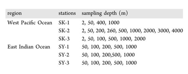 根據(jù)Sprintall et al.等人的研究,其將海水分為表層海水(0-200m)、鹽躍層水(200 - 600米,位于鹽躍層內(nèi))、中層水(鹽躍層以下600 - 1500米)、深層水(1500 - 4000米)。李道季教授課題組成員結(jié)合這些信息在西太平洋與東印度洋分別了布置了3組相對(duì)應(yīng)采樣站位,其每次過(guò)濾水樣為10000L,具體采樣計(jì)劃見(jiàn)圖2。