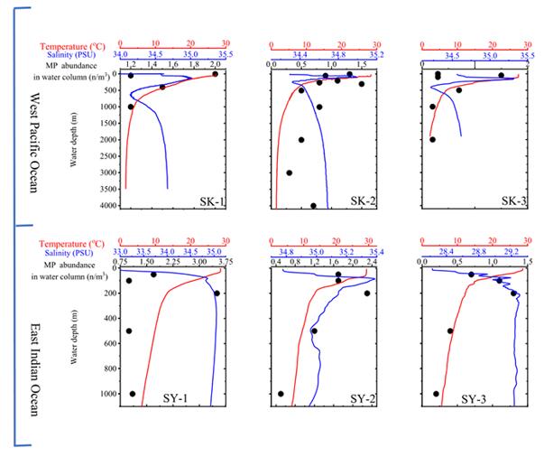 李道季教授團(tuán)隊(duì)認(rèn)為,海洋密度層可能是影響微塑料顆粒垂直分布的重要因素,因?yàn)榇蠖鄶?shù)微塑料會(huì)在這一層被截留。較小的微塑料顆粒受到水動(dòng)力的作用,更容易穿透溫鹽變化的密度層。此次研究中,SK-2、SK-3、SY-1、SY-2、SY-3這5個(gè)水層的數(shù)據(jù)證實(shí)了這一理論,其中鹽躍層上方微塑料的豐度高于表層,在波羅的海同樣也發(fā)現(xiàn)類(lèi)似的結(jié)論。