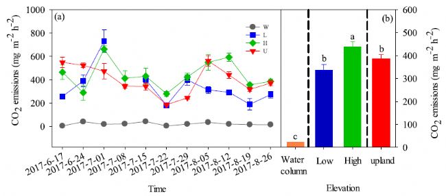 作者于2017年6-8月測量了土壤/水大氣界面CO2和CH4的交換率。利用ABB LGR CO2同位素分析儀分析CO2的濃度及δ13C,并利用ABB LGR甲烷碳同位素分析儀分析CH4的濃度及δ13C。