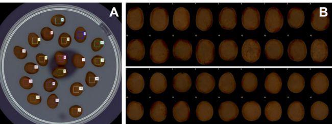 A – 具有標(biāo)記區(qū)域 (ROI) 的咖啡豆; B – 從培養(yǎng)皿中提取的單個(gè)阿拉比卡(頂部)和羅布斯塔(底部)咖啡豆。