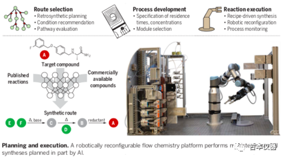 合成復(fù)雜有機(jī)分子的能力是發(fā)現(xiàn)和制造功能化合物(包括小分子藥物)的關(guān)鍵。盡管有先進(jìn)的實驗室自動化,合成路線的識別和開發(fā)仍然是一個人工過程,實驗合成平臺必須手動配置,以適應(yīng)要執(zhí)行的化學(xué)類型,而這就需要專業(yè)化學(xué)家投入時間和精力。理想的自動化合成平臺將能夠規(guī)劃自己的合成路線,并在有助于擴(kuò)大生產(chǎn)目標(biāo)的條件下執(zhí)行它們。