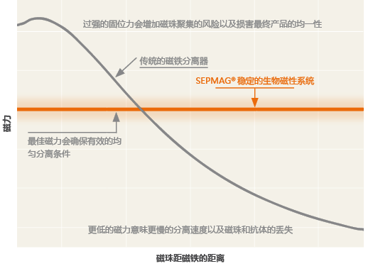 圖1 展現(xiàn)對比了磁珠在傳統(tǒng)磁鐵(灰色)作用下,由于位置不同,受到的磁力不均勻;在SEPMAG ® 生物磁性系統(tǒng)(橙色)中所受到的