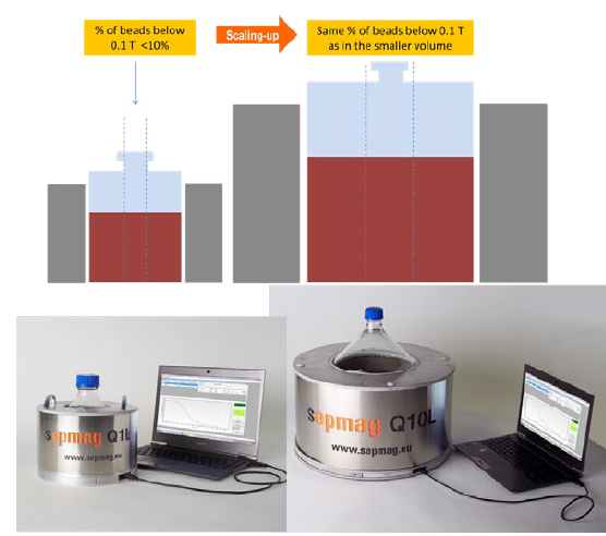 為避免放大對磁性分離帶來的影響,放大分離過程中直接復制原有參數(shù),避免磁珠的損失和避免不可逆磁珠聚集尤其重要,生產(chǎn)企業(yè)可在初期研發(fā)期就采用提供穩(wěn)定磁力和可放大的分離器設備研發(fā)。正如SEPMAG®系統(tǒng)可提供穩(wěn)定的磁力和便利的放大支持,從初始小體積研發(fā)期就可確定明確的工藝條件,研發(fā)期后到放大生產(chǎn),使生產(chǎn)企業(yè)無需重新調(diào)整工藝(如下圖所示),大大縮短了從研發(fā)到生產(chǎn)以及后續(xù)放大所需的時間和資源。