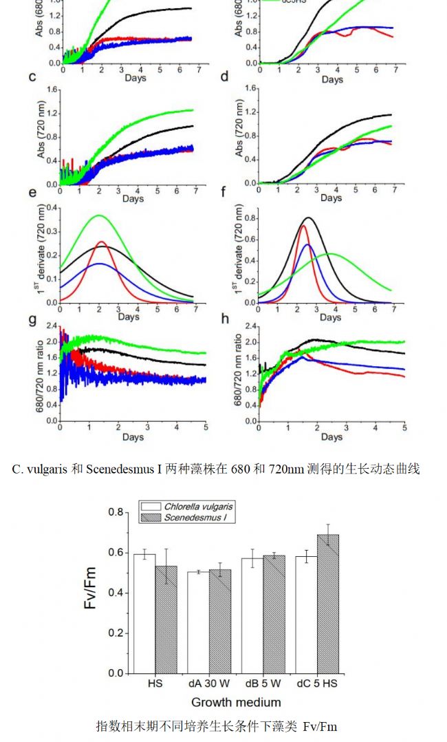 −1,此外為了防止細(xì)胞聚集還配備了氣泡混勻模塊,每5分鐘測量一次光密度Abs680(與葉綠素含量成比例),Abs720(表征細(xì)胞數(shù)),680/720(表征每個細(xì)胞中葉綠素含量的變化)。利用FluorCAM葉綠素?zé)晒獬上駵y量Fv/Fm參數(shù),評估藻類隨時間積累后的脅迫增加,高光條件下該值在0.5到0.59之間變化,唯一的例外是在dC5HS中生長的Scenddesmus I藻株,其Fv/Fm高達(dá)0.69。以上結(jié)果表明,不同生長介質(zhì)中的生長并未顯著改變 PSII 的量子效率。