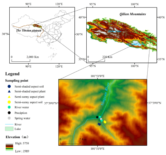 水分是植物生長(zhǎng)不可或缺的因素,水分有效性的波動(dòng)直接影響植物的生長(zhǎng)、數(shù)量和空間分布。在全球氣候變化下,區(qū)域降水格局已經(jīng)發(fā)生了改變。植物不同水源的貢獻(xiàn)率反映了生態(tài)系統(tǒng)對(duì)氣候變化的響應(yīng)程度。因此,追蹤和分析植物水源可以為研究全球氣候變化提供參考。祁連山位于青藏高原東北緣,是中國(guó)西北地區(qū)重要的生態(tài)屏障。因此,研究亞高山生境植物水源對(duì)于理解祁連山生態(tài)和水文過程具有重要意義。已有很多學(xué)者利用氫氧穩(wěn)定同位素(δ2H和δ18O)進(jìn)行了諸如此類的研究,但關(guān)于亞高山生境不同坡向植物水源的研究鮮少報(bào)道。