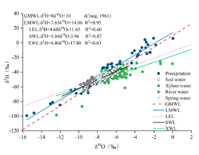 基于此,在本研究中,來自西北師范大學(xué)和中科院西北生態(tài)環(huán)境資源研究所的研究團(tuán)隊(duì)監(jiān)測(cè)了青藏高原東北緣祁連山東段冷龍嶺北坡的上池溝(37°38′10″N,101°51′9″E,3080 m a.s.l.,圖1)的降水、土壤水、木質(zhì)部水、降水和泉水的穩(wěn)定同位素組成以及相關(guān)環(huán)境變量(氣象和土壤水變量),利用LI-2100全自動(dòng)真空冷凝抽提系統(tǒng)(北京理加聯(lián)合科技有限公司)提取土壤和木質(zhì)部中的水分,并利用ABB LGR T-LWIA-45-EP液態(tài)水同位素分析儀測(cè)定所有水樣的δ2H值和δ18O值;谶@些數(shù)據(jù),分析了不同水體穩(wěn)定同位素的變化,并利用多源線性混合模型(IsoSource)計(jì)算不同水源對(duì)植物的相對(duì)貢獻(xiàn)率。