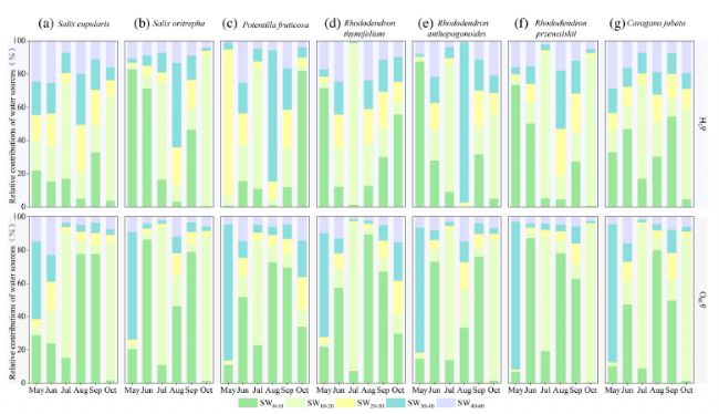 青藏高原東北緣的亞高山生境中灌木的水分吸收特征相似。特別是灌木木質(zhì)部水分主要來源于0-30cm土壤水。在降水量少或需水量大的月份,同一生境的亞高山灌木爭(zhēng)奪淺層土壤水。在此期間,為了滿足生長(zhǎng)所需的水分,一些亞高山灌木增加了對(duì)深層土壤水的利用,導(dǎo)致同一生境中亞高山灌木水源存在明顯差異。同樣,在旱季或生長(zhǎng)季,半陽坡或半陰坡的亞高山灌木對(duì)深層土壤水的利用增加,導(dǎo)致不同生境中同一亞高山灌木物種水源存在顯著差異。與其他亞高山灌木相比,杯腺柳(Salix cupularis),山生柳(Salix oritrepha),金露梅(Potentilla fruticosa),硬葉柳(Salix sclerophylla),烈香杜鵑(Rhododendron anthopogonoides)和 隴蜀杜鵑(Rhododendron przewalskii)根據(jù)降水和土壤水條件改變了其水分利用模式,表明其具有較強(qiáng)的環(huán)境適應(yīng)性。在全球變化背景下,為了恢復(fù)亞高山生態(tài)環(huán)境,應(yīng)選擇能夠在旱季或生長(zhǎng)季調(diào)整其水分利用策略的灌木樹種。