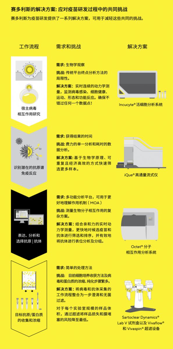 新冠病毒仍然在不斷突變和演化過(guò)程中,應(yīng)對(duì)奧密克戎株的新冠疫苗也已經(jīng)開(kāi)始進(jìn)入臨床試驗(yàn)階段。無(wú)論是現(xiàn)在還是將來(lái),針對(duì)新發(fā)傳染病的病原體研究和相關(guān)疫苗及藥物的開(kāi)發(fā),仍然是持續(xù)不變的課題。如何在不同步驟和階段進(jìn)行快速高效的研究,縮短整個(gè)開(kāi)發(fā)周期,這就顯得非常重要。賽多利斯生物分析部門(mén)提供的高通量分析設(shè)備可以分別在蛋白和細(xì)胞水平對(duì)多個(gè)時(shí)間點(diǎn)的小樣本量的眾多變量進(jìn)行實(shí)時(shí)監(jiān)測(cè),既保證速度和效率,又可以節(jié)約時(shí)間和成本。除了以上案例,對(duì)于新型、有效的療法和疫苗的開(kāi)發(fā),還具備更廣泛的應(yīng)用(如下表所示)。