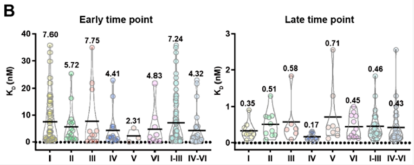 [12],發(fā)現(xiàn)接種第3針滅活疫苗有更好的新冠病毒突變體的廣譜中和活性,可快速引發(fā)B細(xì)胞記憶能力和更持久的體液應(yīng)答,增強(qiáng)免疫反應(yīng)。他們將構(gòu)建的171株抗體在RBD上的結(jié)合位點(diǎn)進(jìn)行表位分析,分為I-VI組。通過(guò)Octet®親和力檢測(cè)發(fā)現(xiàn),識(shí)別IV,V,VI部位的抗體對(duì)突變敏感度較低。