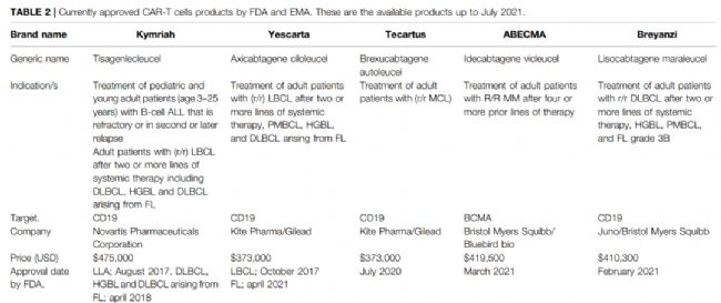 2017年,F(xiàn)DA批準(zhǔn)了CD19 CAR-T細(xì)胞療法(Tisagenlecleucel)適用于兒童和年輕人的ALL。到目前為止,F(xiàn)DA批準(zhǔn)了五種用于癌癥治療的CAR-T細(xì)胞治療藥物。